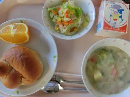 今日は、豆乳入りのクリームシチューです。今朝、豆腐屋さんから届いた豆乳でして、濃厚でとてもおいしい豆乳です。調整豆乳と違って、温度を上げすぎると、分離してしまうので、慎重に温度を上げて仕上げていきます。調理員さんたちの苦労が垣間見える逸品です。