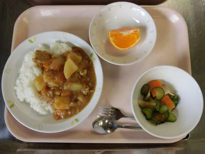 カレーライス、牛乳、シャキシャキ野菜、くだもの(でこぽん)