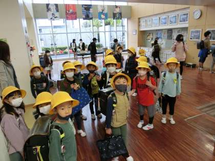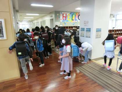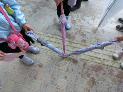 今日は雨の日。雨天時は8時10分よりも前でもいちょうホールに上がって待ちます。あまり密にならないようにね。さすが2年生、傘のたたみ方が上手です。