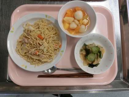 五目焼きそば、牛乳、大根の中華風、フルーツ白玉