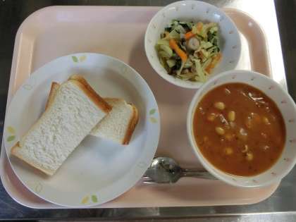 ジャムサンド、牛乳、ビーンズシチュー、野菜ソテー