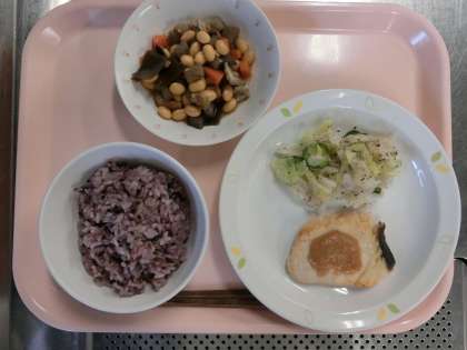 黒米ごはん、牛乳、魚の西京焼き、野菜のゆかりかけ、五目豆