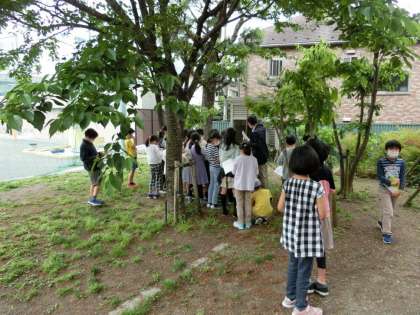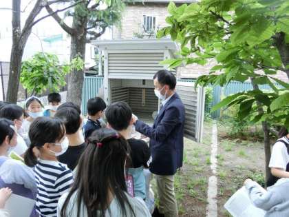 4年生が理科で百葉箱の説明を聞いています。ちなみに気象庁ではもう使われていませんが、学校は相変わらずあるのです。これって昭和の遺物?