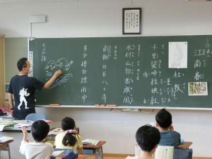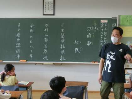 むむ、漢詩「江南の春」。3年生にこの難しい詩が理解できるのか。暗唱できるのか。いやいや、できるんです。最後には全員で詩をそろえて暗唱。まるでミラクルな授業でした。