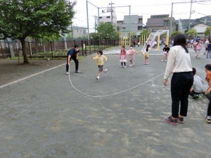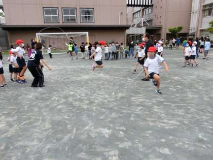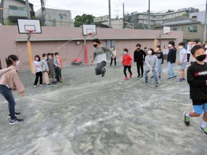 今日の集会は体力作り。上小では年3回長縄大会をやっています。3分間で何回跳べるか。今日の記録が次の大会の目安となります。長繩はチームの協力関係も大切。目標に向かってクラスで協力できるといいね。
