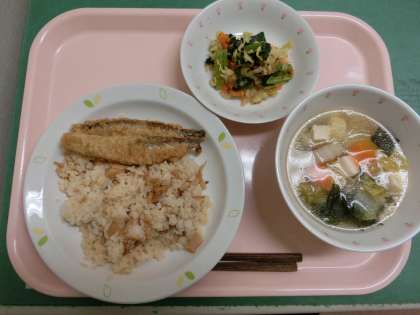 たけのこごはん、ししゃものごま揚げ、豆腐汁、野菜のおかかかけ 牛乳