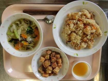 中華おこわ、牛乳、魚と凍り豆腐のからあげ、中華スープ、フルーツゼリー
