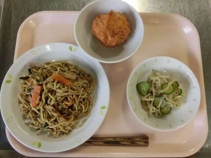 ソース焼きそば、牛乳、きゅうりともやしの中華味、サーターアンダーギー
