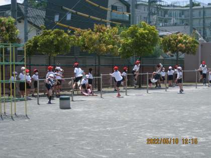 今日は暑いくらいの晴天になりました。校庭では、1年生が両手をしっかり振って一生懸命に長い直線コースを走り切っていました。4年生も短距離走をしたり、雲梯や鉄棒運動を行ったりして一生懸命に体を動かしていました。これから梅雨の時期になるので、校庭での体育の授業は貴重な時間になってくるでしょう。