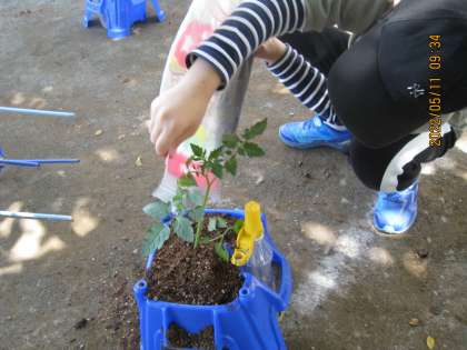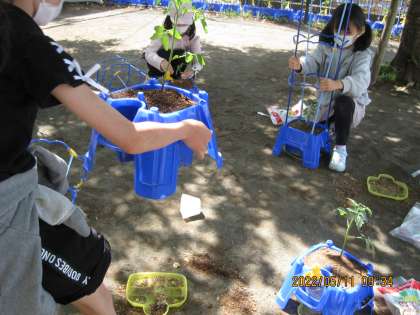 2年生は生活科で、ミニトマトの苗木を自分の植木鉢に植えました。「○○さんのは、もう花が咲いているんだよ。」と教えに来てくれる子もいました。実がなるまでの過程を学べている証拠ですね。保護者の方には、お忙しい中、鉢を学校まで持ってきていただき、ありがとうございました。おいしそうな赤いミニトマトがなるのがとても楽しみです。