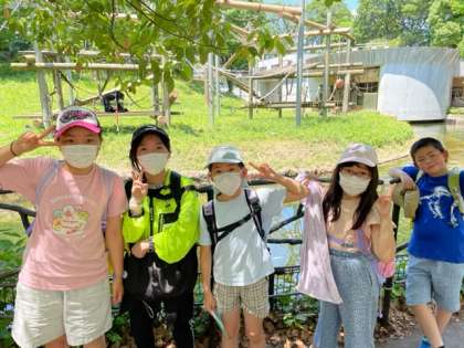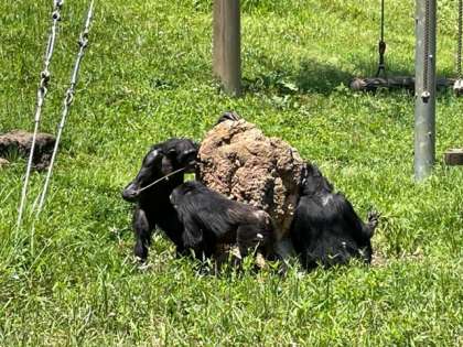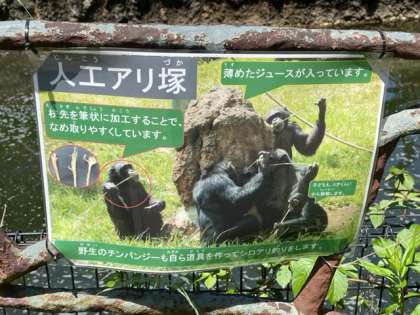 人工蟻塚で薄めたジュースを飲むチンパンジー。おっと、右はチンパンジーではありませんよ。