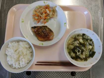 麦ごはん、牛乳、魚の南蛮揚げ、キャベツともやしのおかかかけ、みそ汁