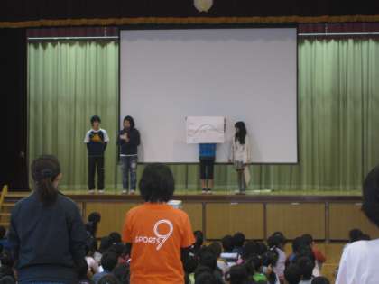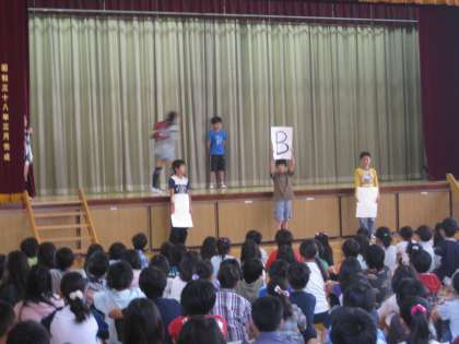 代表委員会は、3、4年生は前期と後期で代表委員が入れかわります。新メンバーをむかえて10月から後期代表委員会が始まりました。前期の人たちがやってきたことを引きついで、がんばりたいことを全校の前で言いました。また、計画委員から、「ろうかは右がわを歩こう」「元気よくあいさつをしよう」のクイズ劇があり、全校児童に守るよう呼びかけていました。