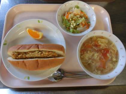 ドライカレーサンド、牛乳、卵とトマトのスープ、野菜のイタリアンドレッシングかけ、くだもの