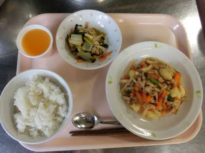 麦ごはん、牛乳、きんぴら煮、青菜と揚げの煮びたし、キャロットゼリー
