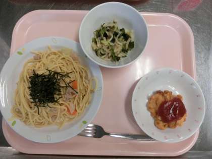 和風スパゲッティ、牛乳、だいこんサラダ、大豆とコーンのフリッター