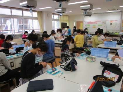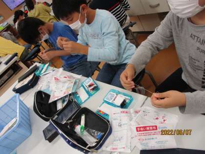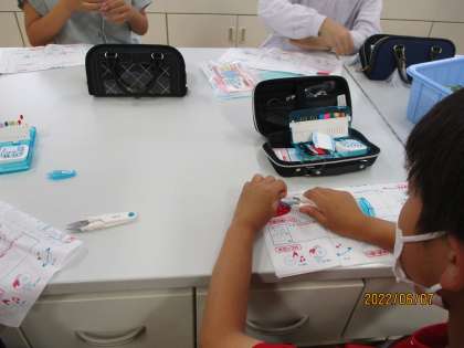 家庭科室では、イチゴのつぶつぶ(種)を糸の玉止めをたくさん作って表していました。うっかり玉結びを忘れて、糸が抜けてしまう子や、ちょっぴり針を指先に刺してしまい、「いたっ。」と声を出している子など…みんななかなか奮闘している様子でしたが、一生懸命に楽しく活動している様子が伝わってきました。