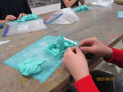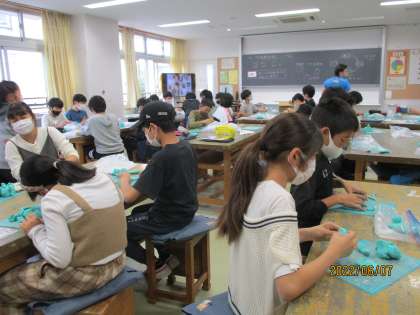 6年生ともなると、思っていることや気持ち、感じていることなど、形のないものを表現する課題に挑戦します。図工室では、粘土を使い、思い思いの形を楽しく表現していました。そうはいってもつい、作りたいものを作ってしまい、近づくと「これ、何だと思いますか?」と嬉しそうに食べ物を作っている子もいて、微笑ましく感じました。