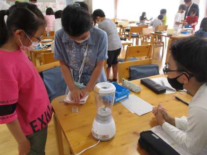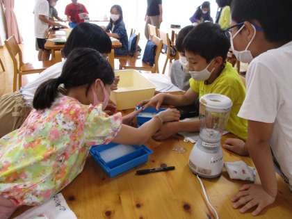 「古紙再生促進センターの出前授業」が行われ、4年生が古紙の再利用として、手すきの紙づくりに挑戦しました。手でちぎった紙(古紙)と水を入れたミキサーで紙をトロトロの状態にし、網目の枠ですくってからそっと枠を外します。タオルで水けを吸い取り、乾かすと…。自分ですくって作ったオリジナルの紙は家に大事に持ち帰りました。2、3日乾かします。どんな紙ができるのか、楽しみですね。