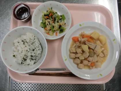 わかめごはん、牛乳、五目うま煮、野菜のおかかかけ、ぶどうゼリー