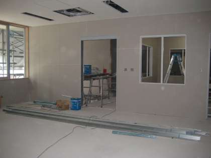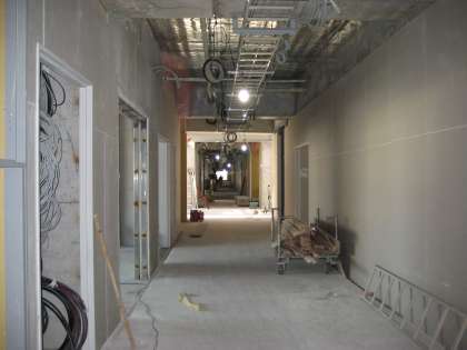 新校舎の工事は、着々と進んでいます。校舎の色は、ベージュとグレーのツートンカラーです。校舎側面には「世田谷区立上北沢小学校」の文字も入りました。窓枠にガラスなども入りました。現在内装工事が進んでいます。