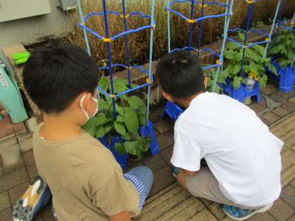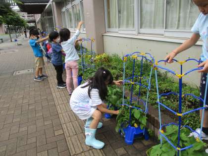 今日は、肥料の粒を土に置いたり、つるのために支柱を立てたりしました。「この棒より、つるがのびて(棒の長さが)足りなくなったらどうなるの?」とかわいい質問が聞こえてきます。