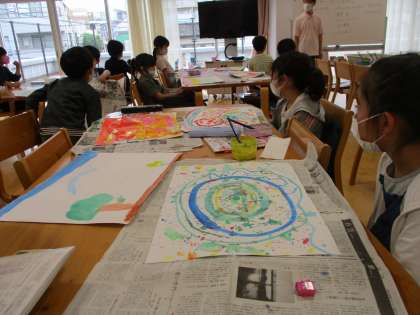 水彩絵の具を使い、大きな画用紙にカラフルな「島」をのびのびと表現しました。