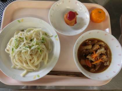 五目ひやしつけうどん、牛乳、ポテトドッグ、くだもの