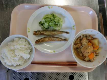 ごはん、魚のカレーあげ、筑前煮、野菜のひとしお