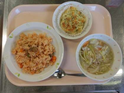 チキンライス、牛乳、ポテトクリーム焼き パスタ入りスープ