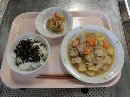 ごはん、牛乳、ひじきのふりかけ、ジャガイモのそぼろ煮、もやしのカレーじょうゆかけ