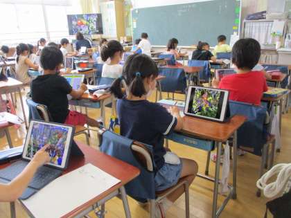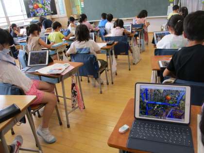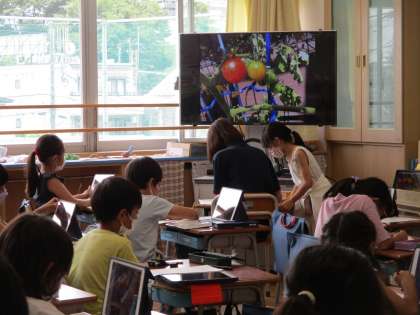 2年生が育てているミニトマトの鉢には、たくさんの実がなっています。校庭に置いてある鉢の様子をタブレットで撮影してきて、その写真を見ながら教室で観察カードにかいていました。「先生に負けないような絵をかかなくちゃ。」と、気合を入れて色塗りをしている子もいました。とてもよく見てかけていますよ!