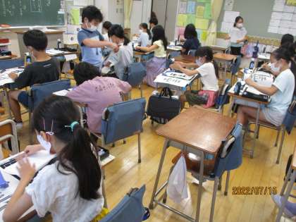 とは、何のこと?と思って教室を覗くと、これから習字で「雲」の文字をかくところでした。点のところがボサボサにならないように書くためのコツを先生が子どもたちに伝えていたのです。