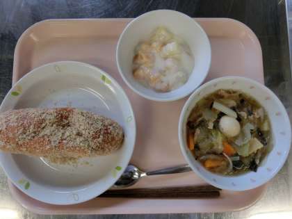 あげパン、牛乳、春雨スープ、フルーツのヨーグルトかけ