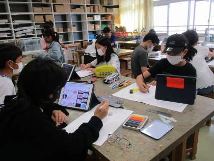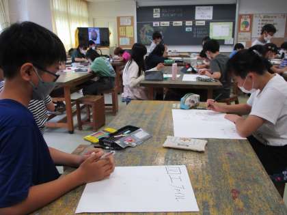 図工室では作品を入れるためのファイルづくりが行われていました。