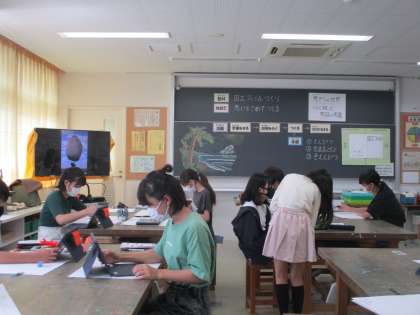 文字の工夫があったり、タブレットで表現したいものを調べたりと、楽しく取り組んでいました。