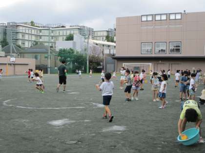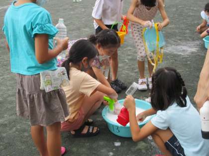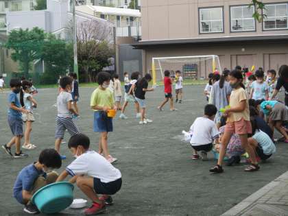 校庭から2年生の歓声が聞こえてきます。家から水遊びのできる道具を持ってきて、校庭で水で遊びました。