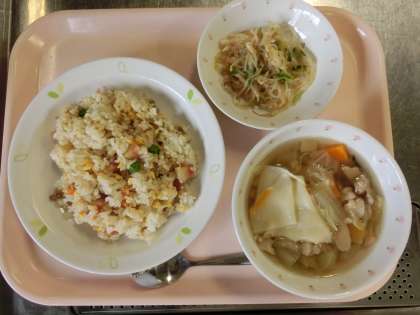 チャーハン、牛乳、もやしのコチュジャンかけ、ワンタンスープ