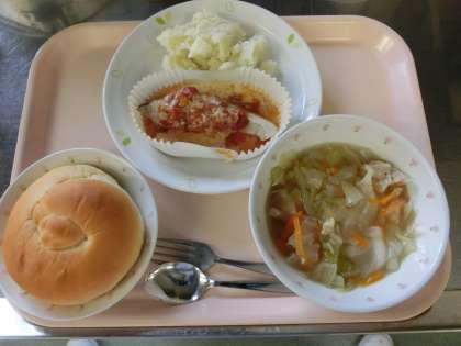 ミルクパン、牛乳、魚のピザ風、じゃがいものクリームあえ、コンソメスープ