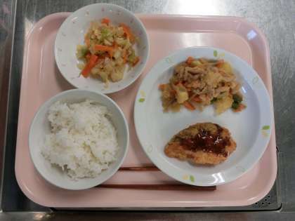 ごはん、魚のフライ、キャベツのおかかかけ、きんぴら煮