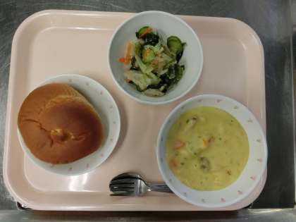 黒砂糖パン、牛乳、パンプキンシチュー、大根とわかめのサラダ