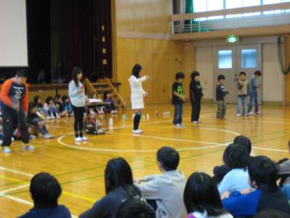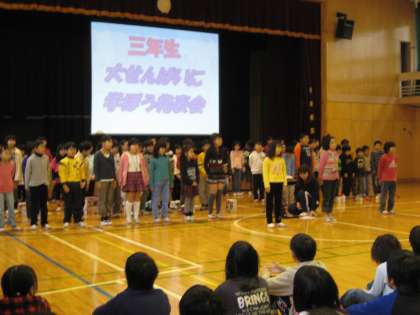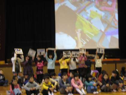 9日(金)の集会は、3年生の学年発表でした。3年生は、総合的な学習の時間におこなった「大先輩に学ぼう」の学習で、地域の大先輩から教えていただいたことを発表しました。百人一首、段ボール工作、きり絵、紙飛行機、けん玉、お茶、手話ダンスの7つの発表でした。子どもたちは、作った作品を見せたり、実際にやって見せたりして、学んだことを一人一言ずつしっかりということができました。