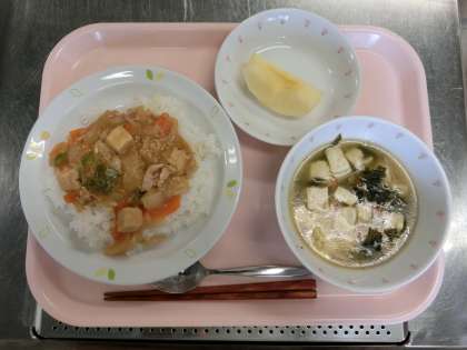 スタミナ丼、牛乳、豆腐とわかめのスープ、くだもの