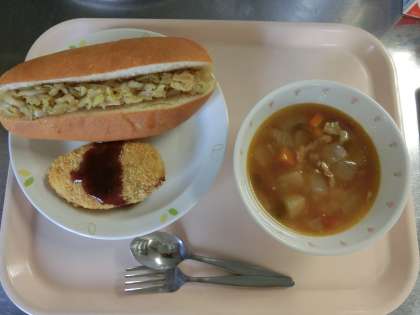 コッペパン、牛乳、コロッケ、ゆでキャベツ、ミネストローネ