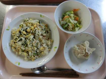 青菜のチャーハン、牛乳、ジャンボしゅうまい、ラーパーツァイ