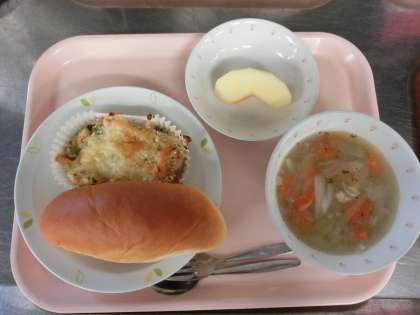 ミルクパン、牛乳、ポテトクリーム焼き、ABCスープ、くだもの