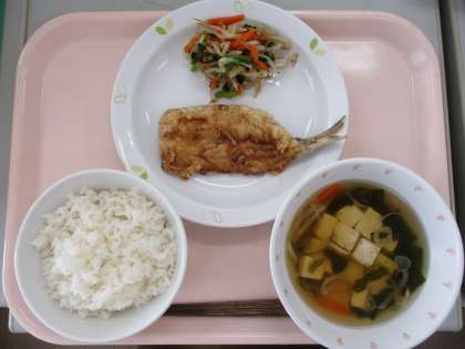 麦ごはん、牛乳、魚のかばやき風、野菜のおかかかけ、すまし汁