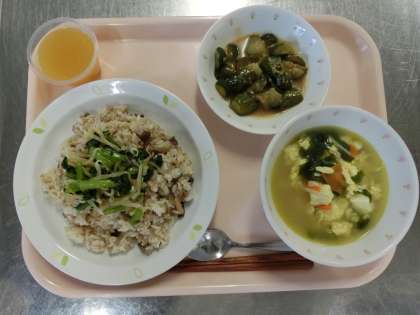 ビビンバ、牛乳、きゅうりのみそソテー、わかめスープ、みかんゼリー