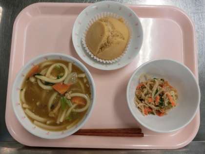 カレーうどん、牛乳、もやしのごまあえ、黒砂糖蒸しパン