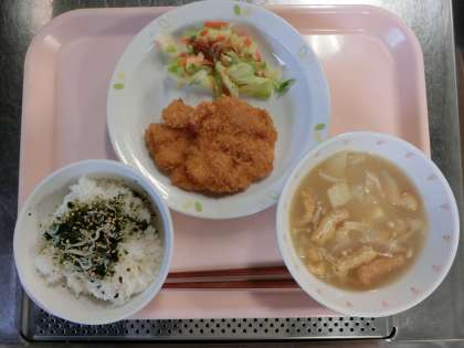 麦ごはん、牛乳、ふりかけ、チキンカツ、ゆで野菜、みそしる